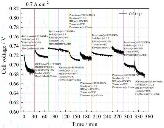 The performance sensitivity test results at 0.70 A cm−2 are presented in Figure 6. It can be observed that, under the conditions of P(a/c/coolant) = 85/70/60 kPa, the stack performance improves with increases in the cooling water temperature and cathode stoichiometric ratio, and optimal performance is achieved at RHa:RHc = 40%:40%, cooling water temperature 72 °C, and Stoich(a/c) = 1.5:3. Conversely, when P(a/c/coolant) = 100/80/70 kPa, with a cooling water temperature of 65 °C and Stoich(a/c) = 1.5:2.5, the stack performance shows a significant decrease.