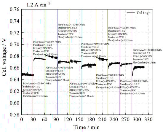 The performance sensitivity test results at a condition of 1.20 A cm−2 are shown in Figure 7. The data indicate that under the condition P(a/c/coolant) = 100/80/70 kPa, stack performance improves with increased cooling water temperature, cathode stoichiometric ratio, and relative humidity. The highest stack performance is achieved with a cooling water temperature of 72 °C, Stoich(a/c) = 1.5:3, and RH(a/c) = 20%/50%. Conversely, when the water temperature is 70 °C, Stoich(a/c) = 1.5:2, RH(a/c) = 30%/50%, and P(a/c/coolant) = 120/100/80 kPa, the stack performance decreases.