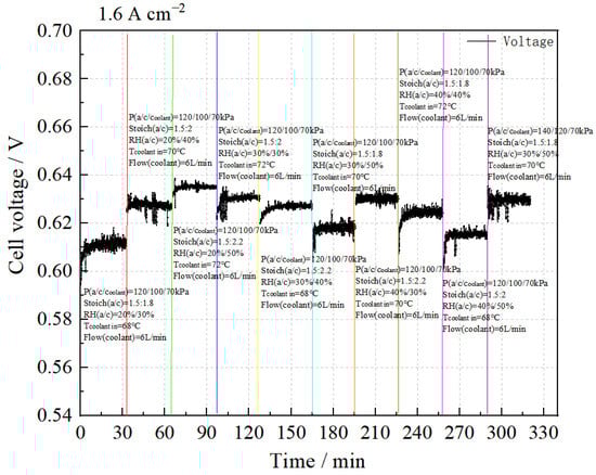 The test results at 1.60 A cm−2 are shown in Figure 8. It can be seen that under the condition P(a/c/coolant) = 120/100/70 kPa, the stack performance increases with increasing cooling water temperature, cathode stoichiometric ratio, and relative humidity. The optimal performance is achieved under the conditions of cooling water temperature = 72 °C, Stoich(a/c) = 1.5:2.2, and RH(a/c) = 20%/50%. When the cooling water temperature is reduced to 70 °C, Stoich(a/c) = 1.5:2, and RH(a/c) = 30%/50%, increasing the back pressure to P(a/c/coolant) = 140/120/70 kPa leads to a significant improvement in stack performance.