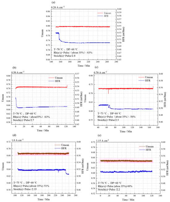 Voltage stability results at 0.20 (a)/0.50 (b)/0.70 (c)/1.00 (d)/1.15 (e) A cm−2.