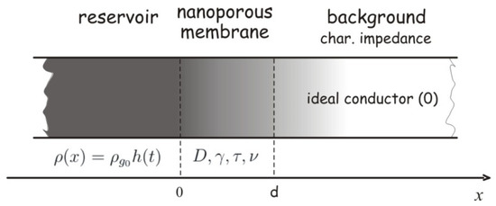 We are observing a porous membrane of thickness d, into which a uniform beam of molecules enters through its lateral surface, so it is convenient to consider the problem in a one-dimensional approximation. The geometry of the problem is illustrated in Figure 1.