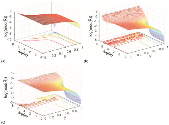 Spectral functions of the normalized profile of particle concentrations within the membrane. The parameters used are , , and s. The (a) classical, (b) exponentially fading memory, and (c) power-law fading memory model.