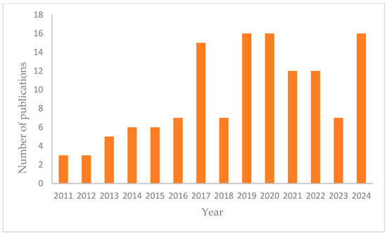 Number of publications per year, from 2011 to 2024, for treating sulfated waters using polymeric membranes; based on Web of Science research using these main keywords: sulfate removal, polymer membrane, and water.