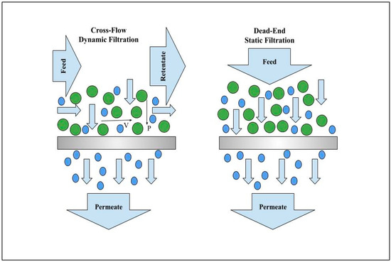 Membranes work in two ways: cross-flow and dead-end. In cross-flow, the liquid moves next to the membrane, and in dead-end, it goes straight onto the membrane surface, as illustrated in Figure 4. The advantage of using cross-flow, as opposed to to dead-end, in sulfate water treatment applications is the enhancement of the lifespan of the membrane by reducing fouling through mechanisms such as shear diffusion, drag force, and internal lift. This helps reduce concentration polarization [109].
