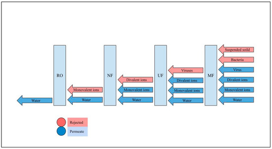 Each membrane is designed to target specific types of contamination, based on its respective capabilities and properties. Figure 5 illustrates the filtration process in different membranes. In response to freshwater scarcity, polymeric membrane technology, particularly NF and RO membranes, has emerged as a promising solution for sulfate removal. Table 3 shows commercial membranes which are recommended and tested by companies for sulfate removal.