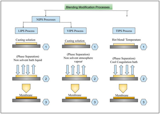 A handful of studies are highlighted in Table 5 in the previous section, focusing on fabricating, testing, and applying various polymeric materials for sulfate removal from water. The fabrication technique discussed in this review is divided into two processes: (i) blending membranes and (ii) surface modification membranes. The blending process creates membranes by phase inversion, denoted as phase separation (PS). A description of PS is presented in the next section. Nevertheless, electrospinning, additive manufacturing, and other fabrication approaches can enhance and adapt polymeric membranes. Despite the different techniques, the ultimate objectives remain consistent, namely, minimizing fouling and enhancing membrane functionality.