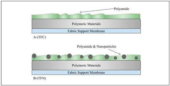 Furthermore, nanoparticles can modify membranes, depending on the specific functional groups needed. However, there is concern about nanoparticles’ potential ecotoxicity [90,91]. In a study, Ba-Abbad et al. [92] discussed the enhancement of polysulfone (PSf) membranes by the addition of hydrophilic cobalt-doped zinc oxide (Co-ZnO) nanoparticles. The study highlights the effectiveness of (Co-ZnO) nanoparticles in reducing the contact angle values from 82° to 62° and increasing the water flux. This membrane achieved a rejection rate for Na2SO4 of about 55%. Wu et al. [93] created a TFN membrane using PSf as a support layer, incorporating mesoporous silica nanoparticles into a polyamide matrix through interfacial polymerization. They found that a covalent bond forms between the silica nanoparticles and the active layer of the TFN membrane. This resulted in membranes with increased pure-water flux values, reaching 32.4 LMH, which is approximately 1.5 times higher than the traditional thin-film composite membranes, while maintaining high rejection rates for Na2SO4 of above 80%, but showing a lower rejection for MgSO4, at just above 30%. The thin-film nanocomposite membrane displays better resistance against fouling and demonstrates satisfactory long-term stability.