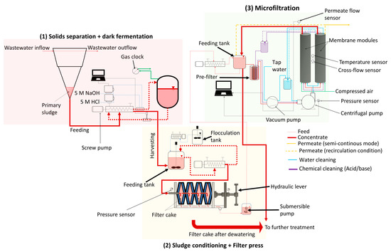 Schematic representation of the cascade comprising (1) solids separation and dark fermentation, (2) sludge conditioning and dewatering using a chamber filter press, and (3) microfiltration.