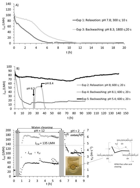 This phenomenon can be further supported by a cleaning procedure employed after complete fouling in Experiment 1 (see Figure 2c). Initially, chemical cleaning was performed with an alkaline solution, which partially restored clean water flux JCW (40 to 50% compared with actual JCW; see Figure 2c). However, with acid cleaning, around 80 to 90% of JCW could be recovered. The drained solution (after acid cleaning) showed visible flocs, resembling flocs formed during flocculation before dewatering (as shown in the photograph in Figure 2c). Acid cleaning is generally performed to remove inorganic fouling via solubilization. Organic fouling is more predominant in microfiltration with wastewater [27]; therefore, the hydroxide ions, along with chelating agents, should have completely removed such a fouling either via saponification, chelation, hydrolysis, and/or solubilization. But the higher recovery of JCW with acid cleaning implies a drastic shift towards a more positively charged membrane which should have repelled HPAS back to the bulk solution.
