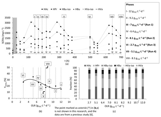 Irrespective of the different OLRs, the percentage of individual SCFAs accounting for total SCFAs was slightly similar (see Figure 3c). However, when evaluating , a stability over a wide range (between 7 and 12 gTOC∙L−1∙d−1) was observed (see Figure 3b) but increased below 7 gTOC∙L−1∙d−1. The highest yields were observed at phases IV (6.4 gTOC∙L−1∙d−1), VI (2.7 gTOC∙L−1∙d−1), and VII (5.1 gTOC∙L−1∙d−1) (see Figure 3b). At lower OLRs, could be improved by around 15 to 50%. OLR is a function of both HRT and concentration of the substrate (here TOC). As mentioned earlier, HRT at phase VI was 72 h, and the higher at this phase VI could be attributed to longer residence times, but it is important to mention that a plateau of was achieved at around HRT of 48 h in the previous study [6], and (here in phase VI) was also lower than or close to the yields observed at phases IV and VII (both of which had HRT of 36 h). Therefore, the effect of lower OLR was suspected to have caused this increase at phase VI.