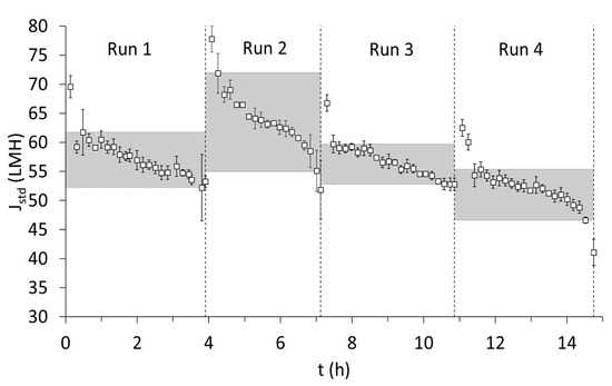 Semi-continuous microfiltration was performed with backwashes every 600 s for 20 s based on the stable results obtained from the recirculation condition in Section 3.1.2. Average cross-flow velocity during the four runs was 3 ± 0.3 m∙s−1. It is important to remember that, similar to the filter press, semi-continuous filtration was performed, but no interim chemical cleaning was performed between the four runs. The membrane underwent only cleaning with clean water between each run. The duration of microfiltration was between 3 and 4 h for all four runs. In all four runs, after a steep decline in standardized flux (Jstd), there was a stable phase that was represented by the upper and lower limits of Jstd during the filtration period of each run (see the shaded region in Figure 4). In runs 1,2, and 3, the stability of Jstd was maintained during the course of filtration, while, in run 4, there was a notable deviation, which could very well indicate the onset of irreversible fouling (around 40 LMH was reached, which was below the lower limit of the shaded region). Further examination into the trend of Jstd during short-term filtration showed that Jstd was much higher for the experimented duration compared with the long-term experiment performed under similar physical cleaning conditions (Experiment 4 in Section 3.1.2; see Figure 2b). In Experiment 4, the range of 50 to 60 LMH could only be maintained for a period of 3 h, which was almost close to the duration of filtration of one run. One reason could be attributed to the reduced dosage of hydroxypropyl trimethyl ammonium starch, while another possible explanation would be the inclusion of short intermittent cleaning with clean water, which could potentially sustain Jstd for longer durations. Nevertheless, by the end of run 4, a total of around 900 L∙meff, area−2 of filtrate was treated; thus, this is the amount of filtrate after which chemical cleaning must be performed to restore the flux in accordance with the procedure described in Section 3.1.2 and Figure 2c.