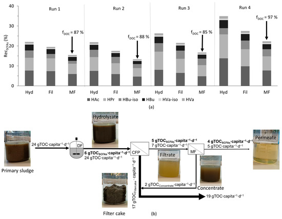 Although with microfiltration a particle-free permeate could be produced with permeate quality (fDOC) of 85 to 97%, there was a drawback in terms of the decline in the overall recovery of SCFAs (RecSCFAs), which can be attributed to volume recovery (Vrec) (see Figure 5a). It is important to mention that the 70% Vrec achieved with microfiltration was a system limitation, and the recovery of SCFAs (RecSCFAs) could be increased by having a higher Vrec, provided there was not a high significant retention of SCFAs. Nevertheless, the overall value of RecSCFAs after microfiltration was around 15%. However, with the observed increase in yields at low OLRs in dark fermentation, the RecSCFAs could be potentially increased by at least 20%. From both primary and excess sludge, around 24 gTOC∙capita−1∙d−1 was generated. Based on the yields observed in this study after microfiltration (with primary sludge), around 4 gCSCFAs∙capita−1∙d−1 could be recovered from the solids stream (primary and excess sludge) of municipal WWTP (see Figure 5b).