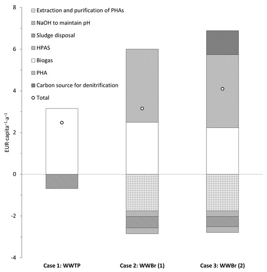 The organic carbon load was 24 gTOC∙capita−1∙d−1 produced as primary and excess sludge. For case 1, the revenue generated was based on the conversion of organic carbon to biogas. The amount of revenue generated based on the electrical energy obtained (from methane) through combined heat and power was 0.36 EUR∙kgTOC−1 [2]. Therefore, based on the TOC load (24 gTOC∙capita−1∙d−1), this was equivalent to a revenue of 3.15 EUR∙capita−1∙a−1, while the cost associated with sludge disposal was around EUR 100 per ton of TS [33]. Based on the solids load generated, the sludge disposal costs amounted to 0.68 EUR∙capita−1∙a−1.