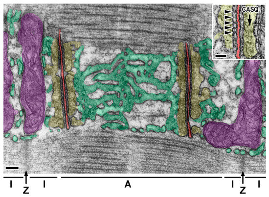 The first description of the ER in skeletal muscle cells by Porter and Palade in 1957 revealed the existence of a particular vacuolar system that was originally referred to as the sarcoplasmic reticulum (SR) [3]. The elegant description of the SR depicted a continuous reticular configuration organized as a sleeve-like structure around myofibrils that regularly segmented in phase with the striations of the associated sarcomeres, a disposition that prompted the supposition that the SR was functionally important in muscle contraction [3,9]. Indeed, the SR can be clearly distinguished in two highly specialized subdomains composed of tubules and cisternae or sheets: the tubular domain forms the longitudinal SR (l-SR), arranged around the M- and Z-lines of each sarcomere, and is mainly devoted to Ca2+ uptake thanks to the presence of sarcoplasmic/endoplasmic reticulum Ca2+ ATPase (SERCA) pumps and their regulatory proteins like phospholamban and sarcolipin; sheet-like structures form the junctional SR (j-SR), consisting of flat cisternae localized, in mammals, at the border between the A- and I-bands of each sarcomere and facing regular invagination of the sarcolemma, the TTs. The structure formed by two terminal cisternae and one TT is called a triad (Figure 1). The j-SR is responsible for Ca2+ release in response to nerve stimulation and thus allocates the components of the Ca2+ release complex, including the ryanodine receptor type 1 (RYR1), triadin, junctin, and calsequestrin [10,11,12]. Mutations in these proteins are linked to various forms of human myopathies [13,14,15,16].
