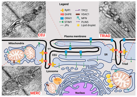 For the purposes of this review, it is noteworthy that the first MCSs were observed in striated muscle cells in the 1950s between the ER—referred to as the sarcoplasmic reticulum (SR)—and transverse tubules (TTs), which are specialized regions of the plasma membrane (PM) [3]. Additional MCSs were later identified in muscle cells, connecting the SR with other organelles, such as mitochondria, lipid droplets, and lysosomes. More recently, MCSs that do not involve the SR have also been discovered.
