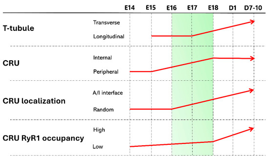 The maturation of the triad occurs in two distinct phases (Figure 3). The first phase coincides with the development of the SR. Between E14 and E16, a gradual change in the organization and localization of CRUs is observed. Initially, CRUs are primarily located at the cell periphery, forming peripheral couplings or shallow junctions with short, wide invaginations of the PM. Over time, these peripheral couplings are replaced by internal junctions, which initially consist of a single SR cisterna flanking a TT (a structure known as a dyad), and later acquire a second SR cisterna to form the complete tripartite triad complex [75]. As seen for the SR, there is a significant acceleration in triad maturation between E16 and E18, as peripheral couplings disappear entirely, and internal junctions become the predominant structural feature. During this critical period, CRUs shift from a random distribution across sarcomeric regions to a more localized positioning at the A-I-band interface. This transition is also marked by an increasing presence of RYR1 feet within the junctional gap. At E14 and E15, these feet are sparse or absent, by E16, about half of the SR junctional surface is covered with RYR1 feet, and this proportion increases to approximately 80% by E18 [75]. The second phase of maturation mirrors the final development of the TT system, beginning at birth and continuing through the first two weeks of life. By the end of this period, triads present with the TT oriented perpendicular to the fiber axis and longitudinally disposed SR cisternae.