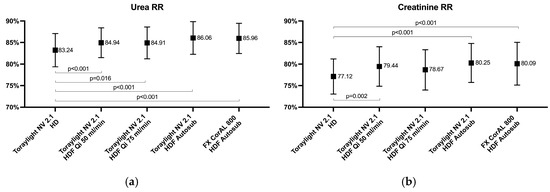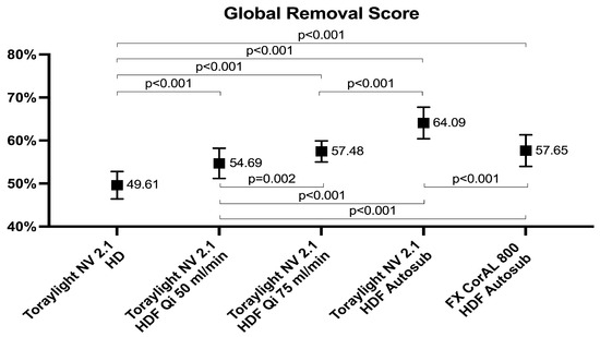 - Maduell, F.; Rodas, L.; Broseta, J.J.; Gomez, M.; Xipell, M.; Guillen, E.; Montagud-Marrahi, E.; Arias-Guillén, M.; Fontseré, N.; Vera, M.; et al. Medium Cut-Off Dialyzer versus Eight Hemodiafiltration Dialyzers: Comparison Using a Global Removal Score. Blood Purif. 2019, 48, 167–174. [Google Scholar] [CrossRef] [PubMed]