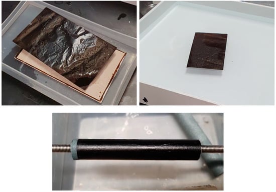 GO membrane with an area of 150 cm2 detaching from CaSO4 plate in SDS-water solution (top-left), membrane under washing by immersion in DI water (top-right), and tightly wrapped around a 10 mm diameter (bottom) porous ceramic substrate in a tube shape.