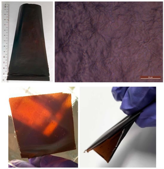 A representative overview of membranes fabricated based on metal oxides/carbide as cross-linking agents and sources is presented in Figure 2. The large-area membrane cross-linked with CaSO4, shown in Figure 2, displays a relatively smooth, crack-free, and uniform surface, as confirmed by optical microscopy in Figure 2-top. A bendable, semi-translucent membrane (with a brown colouration) fabricated using Al2O3 is shown in Figure 2. Due to the insolubility of Al2O3 in water, some localised concentration points and defects were observed. However, the membrane remained mechanically stable and flexible, as demonstrated in Figure 2. Similar membranes were obtained with Nb2O5.