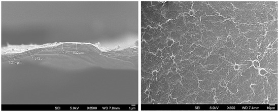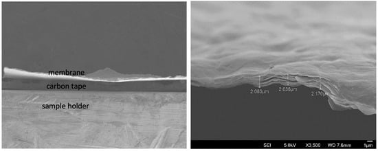 The SEM general view in Figure 3 shows a membrane made by casting onto a SiC plate. Moreover, a cross-sectional view evidences the undulated microstructure and crack-free surface and reveals the characteristic laminated microstructure of GO membranes with an average thickness of approximately 2.09 μm.