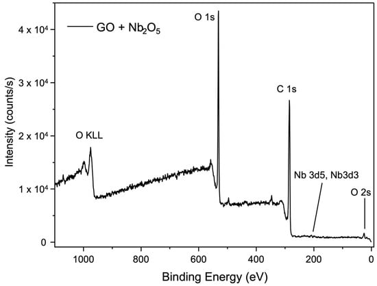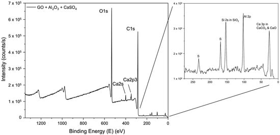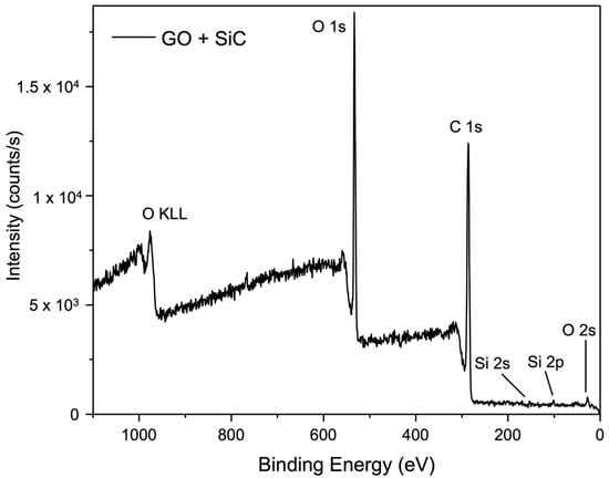 X-ray photoelectron spectroscopy (XPS) was performed to investigate the detailed chemical composition of selected GO membranes, including pure GO and membranes cross-linked with CaSO4 + Al2O3, Nb2O5, and SiC. The survey spectrum of the pure GO membrane (Figure 8) reveals its clean composition with no impurities. The spectrum presents peaks corresponding to the binding energies of C1s, O1s, and O2s, confirming the expected elemental composition of GO.