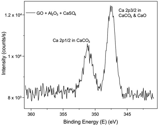The detailed Ca2p scan spectrum in Figure 10 further confirms the chemical states of calcium. It shows two main components due to spin–orbit coupling, with Ca2p3/2 at approximately 347.4 eV and Ca2p1/2 at around 351.1 eV. These peaks are attributed to the presence of calcium in the forms of CaCO3 and CaO. They display slightly higher binding energy due to the bonding with GO.