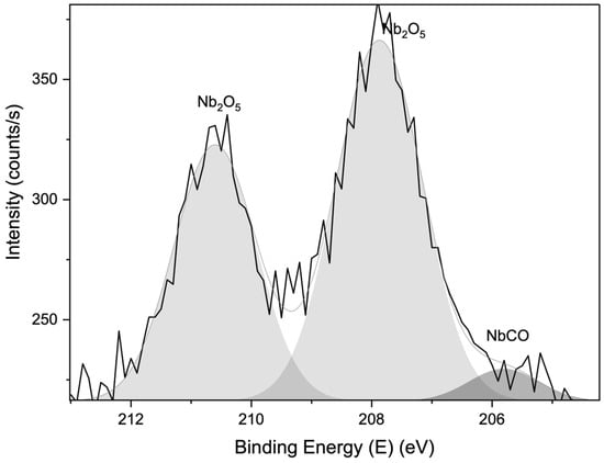 XPS spectra, with a large acquisition area of 50 × 100 μm, were taken from the membranes to further characterise the interaction of oxide compounds with the functional groups of GO. A qualitative comparison of the narrow C1s and O1s spectra of Nb2O5-cross-linked GO, CaSO4 + Al2O3-cross-linked GO, and pure GO (Figure S7) reveals differences in their peak shapes and areas, particularly in the C1s region associated with oxygen-containing functional groups [24,25,26,27,28]. In Figure 13, the XPS spectrum of the Nb3d binding energy region reveals the formation of carbide species. Considering that Nb is a transition metal, its behaviour as a cross-linking agent can be described as similar to the case of TiO2 nanoparticles and GO, as reported in the recent literature [29,30], where TiO2 reacts with the C–O and C–OH groups of GO, converting them into Ti–O–C and Ti–C species. Likewise, the formation of carbonates was observed in the case of the CaSO4 cross-linking-based membrane, as discussed above. The formation of carbides from the interaction of the cross-linking agents and the GO functional groups, detected by XPS peaks in the different samples, is summarised in Table 2.