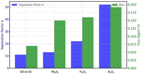 Pervaporation tests for the mixture of ethanol/water 80/20 w/w at room temperature were also performed with pure GO and cross-linked self-standing membranes to investigate the effect of cross-linking on the separation performance and mechanical stability. All membranes were fabricated with the same amount of GO (20 mg) by casting four layers using the procedure described in the methodology section. The results in Table 6 show that the Al2O3 cross-linked membranes exhibited separation factors nearly three times higher, with similar or higher flux compared to the pure GO membranes. Figure 16 illustrates the superior performance of the membranes made with oxides and carbide cross-linkers compared to the pure GO membranes regarding the separation factor and pervaporation separation index. The selectivity to water over ethanol is related to the hydrophilicity of the oxides. This explains why the best performances were obtained for the membranes containing Al2O3, which is the most hydrophilic [34].