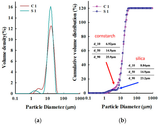 Volume-weighted particle size distribution curves of (a) cornstarch and (b) silica particles with an average size of 14.9 μm. The x-axis has a logarithmic scale.