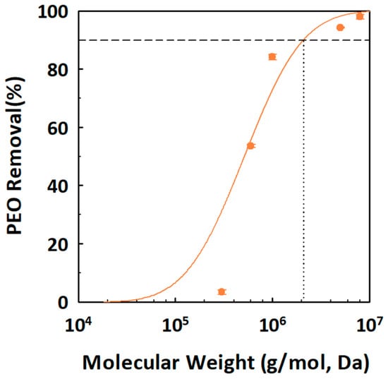 To estimate the average pore size of the ceramic membrane, retention experiments were performed using PEO solutions with five distinct MWCO values. The cumulative log-normal distribution function for PEO retention, shown in Figure 4, indicates that PEO solutions with 90% retention efficiency correspond to an average pore size of about 53.5 nm, equivalent to an MWCO of approximately 2088 kDa (Equation (1)). Although this value is smaller than the manufacturer-specified pore size of 0.1 µm, it remains within the expected range for MF membranes, which typically have MWCOs above 1000 kDa [42]. This discrepancy may stem from variations in measurement methods or operating conditions. Nonetheless, the results confirm the ceramic membrane’s effective retention of PEG molecules, demonstrating its suitability for applications that require precise molecular separation.
