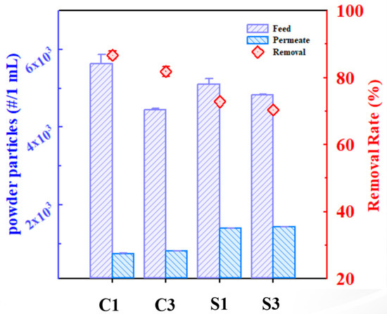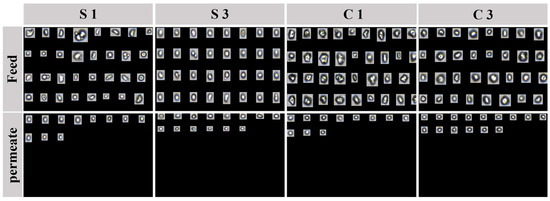 The change in particle counts before and after ceramic membrane filtration provides critical insights into the removal efficiency of microplastic alternatives in cosmetics. This study employed FlowCam to analyze particle count variations for cornstarch and silica powders, facilitating a comparative evaluation of their removal efficiencies. Representative images of the microplastic alternatives, captured before and after ceramic membrane filtration, are presented in Figure 5. The FlowCam setup was optimized to reduce image duplication and enhance the accuracy of particle count measurements. Measurements were performed at 10× magnification, enabling detailed observation of particle morphology and behavior. The flow rate was maintained at 0.125 mL/min to ensure steady sample movement through the system, and imaging was conducted at an auto-capture rate of 13 frames per second to obtain high-resolution data. Following image capture, a thorough filtering process was applied to remove noise, such as bubbles or non-particle artifacts, ensuring both quantitative and qualitative accuracy. The filtering criteria used for analysis are provided in Table S1. These criteria were carefully selected to emphasize the physical attributes of the particles, filter out irregular objects, and ensure that only relevant microplastic alternatives were included in the analysis. This filtering procedure facilitated the identification of actual microplastic alternatives based on their geometry and optical characteristics, establishing a robust protocol for accurate and reproducible particle tracking and analysis.