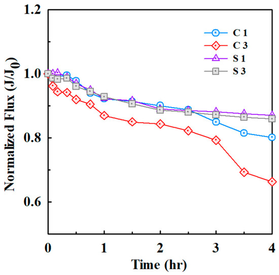 The comparison of fouling behavior between the cornstarch and silica revealed that the cornstarch induced membrane fouling more rapidly than the silica (Figure 7). In a similar study, physically reversible resistance was identified as the primary form of resistance for ceramic MF membranes, primarily due to cake layer formation, which could be easily removed through washing [31]. This rapid membrane fouling is primarily attributed to the physical structure and chemical composition of cornstarch [44]. Composed of polysaccharides, cornstarch swells upon interacting with water, which increases its viscosity [45]. The density of cornstarch can vary depending on the measurement method, typically ranging from 1.45 to 1.60 g/cm3. Additionally, the swelling power of cornstarch increases with temperature and time [46]. This swelling causes the cornstarch particles to occlude membrane pores, thereby promoting fouling [47]. Additionally, water absorption leads to gelation, wherein polymer chains form hydrogen bonds with water, further increasing viscosity and contributing to the accumulation of viscous materials on the membrane surface [48,49]. This process significantly increases filtration resistance, thereby reducing permeate flux and shortening membrane lifespan [50]. These effects are corroborated by observed changes in solubility over time. Both the cornstarch and silica exhibited increased solubility over time; however, the cornstarch demonstrated a significantly faster rate of increase (Figure S1). This rapid solubility increase is attributed to its hydrophilic nature, which enhances viscosity and resistance during filtration [51,52]. In contrast, the silica, a chemically inert and stable material [45], exhibited slower fouling formation. Its negatively charged surface limits particle adhesion and aggregation, enabling it to pass through the membrane more easily [47,48]. Consequently, the silica experienced less physical fouling than the cornstarch, maintaining stable filtration performance. In summary, the rapid fouling observed with the cornstarch stems from its gelation properties, whereas silica’s stability and minimal interaction with water contribute to its slower fouling rate. This comparison highlights the importance of understanding the behavior of microplastic alternatives in optimizing filtration and extending membrane lifespan.