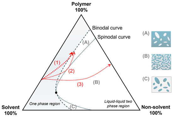 The composition path can be changed with extended precipitation time, as observed in Line 3 of Figure 1 [20]. Furthermore, according to the position where the L–L demixing in the ternary phase diagram occurs, three composition path possibilities can happen when crossing the binodal line: (i) under the critical point, (ii) above the critical point, or (iii) through the critical point. The first happens with solutions of low polymer concentration, in which the demixing by nucleation of the polymer-rich phase creates droplets of concentrated polymer, resulting in a latex-like structure (Figure 1C) [3]. In the second possibility, the demixing occurs by nucleation of the polymer-lean phase, forming a porous structure due to the droplets of lower polymer concentration (Figure 1A). If the droplets bond before the polymer-rich phase solidifies, an open porous system will be formed. The third possibility causes the instantaneous L–L separation because it directly reaches a metastable region, forming a membrane with a bicontinuous morphology of interlaced droplets of lower and higher polymer concentrations (Figure 1B) [6].