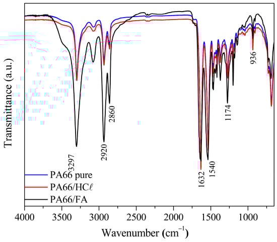 FT-IR analyzes were performed for PA66/HCℓ and PA66/FA membranes, as well as for pure PA66 as a comparison, as seen in Figure 3. Polyamide did not change its structure with the use of solvents, which is evidenced by the presence of PA66 characteristic bands, such as N–H stretching at 3297 cm−1, C–H2 stretching at 2920 and 2860 cm−1, and C=O amide stretching at 1632 cm−1. Similar results were described for PA66 membranes prepared using HCℓ as solvent [3,54,55]. The 936 cm−1 band is attributed to the PA66 crystalline phase and the trans conformation of the crystalline and amorphous phases, while the bands between 1144 and 1180 cm−1 are referred to as N-C=O skeletal vibrations of amorphous phases [56]. The presence of all bands from pure PA66 in PA66/FA and PA66/HCℓ membranes indicates the removal of solvents during the IP method did not modify the polymer structure [41].