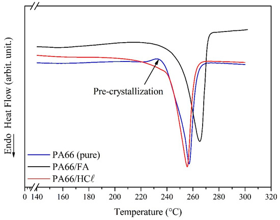 DSC curves for pure PA66, PA66/HCℓ, and PA66/FA membranes.