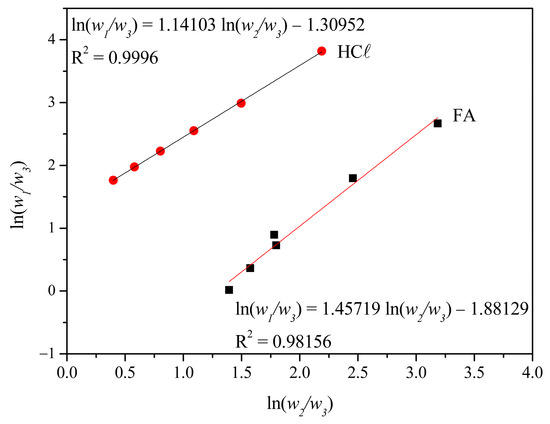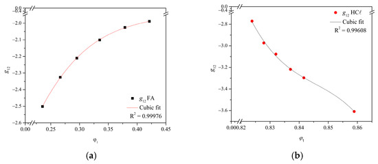 The liquid–vapor equilibrium data for the H2O/FA system are available in the literature; however, they are not found for the H2O/HCℓ system. So, from non-solvent/solvent amounts added in the different solutions, the Aspen Plus 7.3 software was used to estimate the liquid–vapor equilibrium values using the Universal Functional Activity Coefficient (UNIFAC) [47,48,49] method for both systems (HCℓ and FA). The software determined the Gibbs free energy of mixing for the systems, and g12 was then calculated by Equation (5).