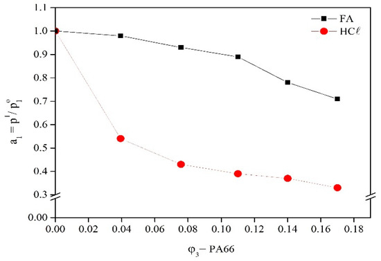 The Gibbs free energy calculated by the Flory–Huggins method (Equation (7)) is shown in Figure 13 as a behavior of the mixture as a function of the polymer volumetric fraction (φ3) for the PA66/FA/H2O and PA66/HCℓ/H2O ternary systems. The PA66/FA/H2O and PA66/HCℓ/H2O ternary systems present opposite behaviors. While ΔGm increases with φ3 for the PA66/FA/H2O system, it decreases for the PA66/HCℓ/H2O ternary system, probably due to interaction forces. Hydrogen bonds among the three components of the PA66/FA/H2O system cause a reduction in the spontaneity as φ3 increases, which is common since polymer and non-solvent compete for hydrogen bonds with the solvent. In the PA66/HCℓ/H2O system, dipole–dipole interactions happen between solvent and non-solvent, hydrogen bonds between non-solvent and polymer, and between solvent and polymer the possibilities are dipole–dipole, acid–base, and/or similar behavior to a polyelectrolyte solution [33]. This means the chemical affinity among the three components increases the possibilities of interactions, favoring the system’s spontaneity with an increase in φ3.