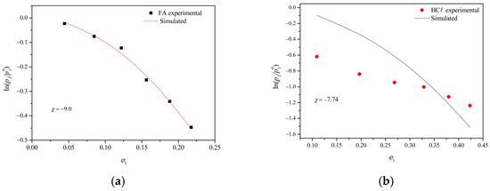 The stoichiometric ratios were established by quantifying the solvent molar concentration (n1) in the vapor phase. The vapor pressure of the solutions (P1) and pure solvents () were determined from the ideal gas equation (PV = nRT). With the values obtained, the solvent activity (a1, Equation (10)) [51], and then, the solvent/polymer interaction parameters (χ23) were calculated for all concentrations by Equation (11).