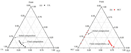 Thomas et al. (2002) analyzed the compositional crystallization trajectory of polyamide 6 (PA6) membranes solubilized in FA [26]. They observed the precipitation beginning at a certain distance from the interface between the membrane and the non-solvent bath and then propagating up and downwards [26]. According to the authors, the membrane formation process is very complex, and the crystallization rate may depend on kinematic (e.g., viscosity) and thermodynamic (e.g., composition and distance from crystallization boundary phase) factors. In addition, working with PA6 and FA, El-Gendi et al. (2012) constructed the ternary phase diagram PA6/FA/H2O through experimental turbidity measurements during titration of PA6/FA solution in water [27]. The authors highlighted that a large amount of water (26–39 wt%) was needed to achieve precipitation and L–L phase separation [27].