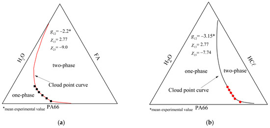 Cloud point curve experimental points and the theoretical curve calculated using the CPL Boom’s correlation for the (a) PA66/FA/H2O and (b) PA66/HCℓ/H2O systems.