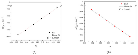 where w1,2,3 are the component’s mass fraction. The intersection (a) obtained through the linearization of Equation (6) is related to interaction parameters and molar volumes, i.e., enthalpic interactions are considered. The linearization slope (b) relates only to entropic parameters, i.e., molar volumes.