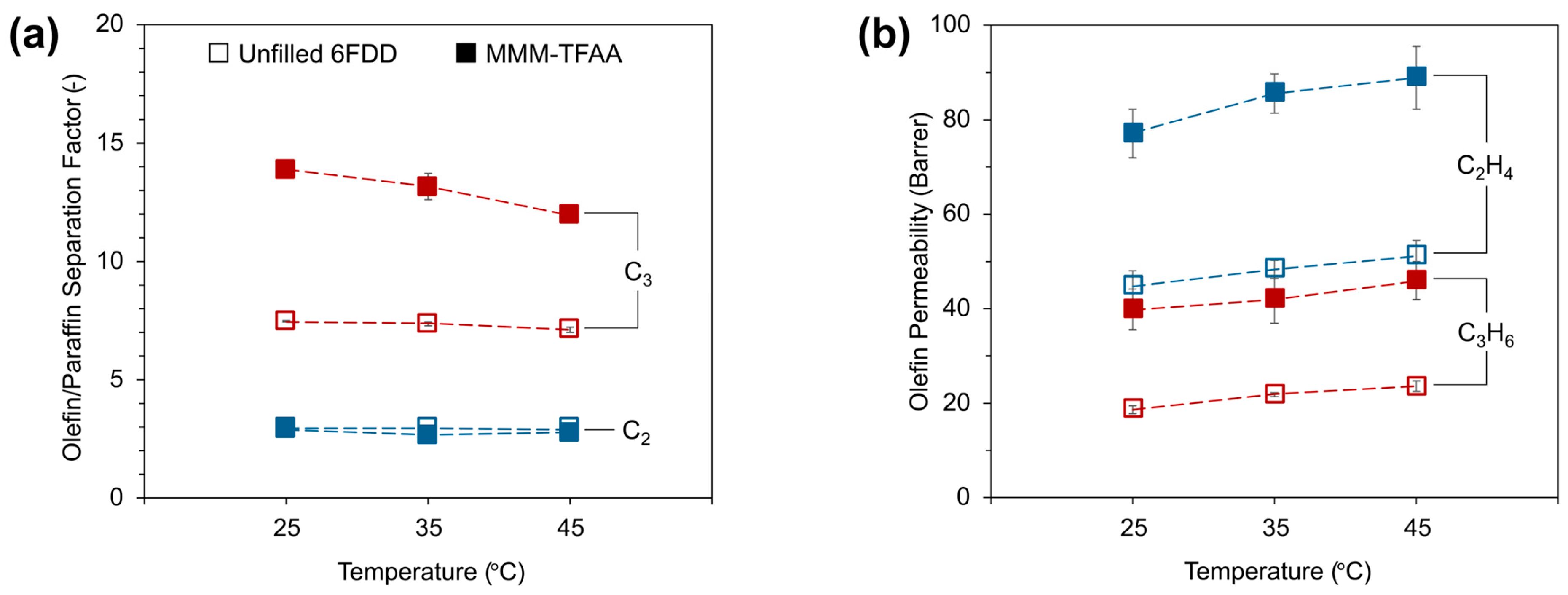 3.4. Effect of Temperature on Olefin/Paraffin Separation Performance