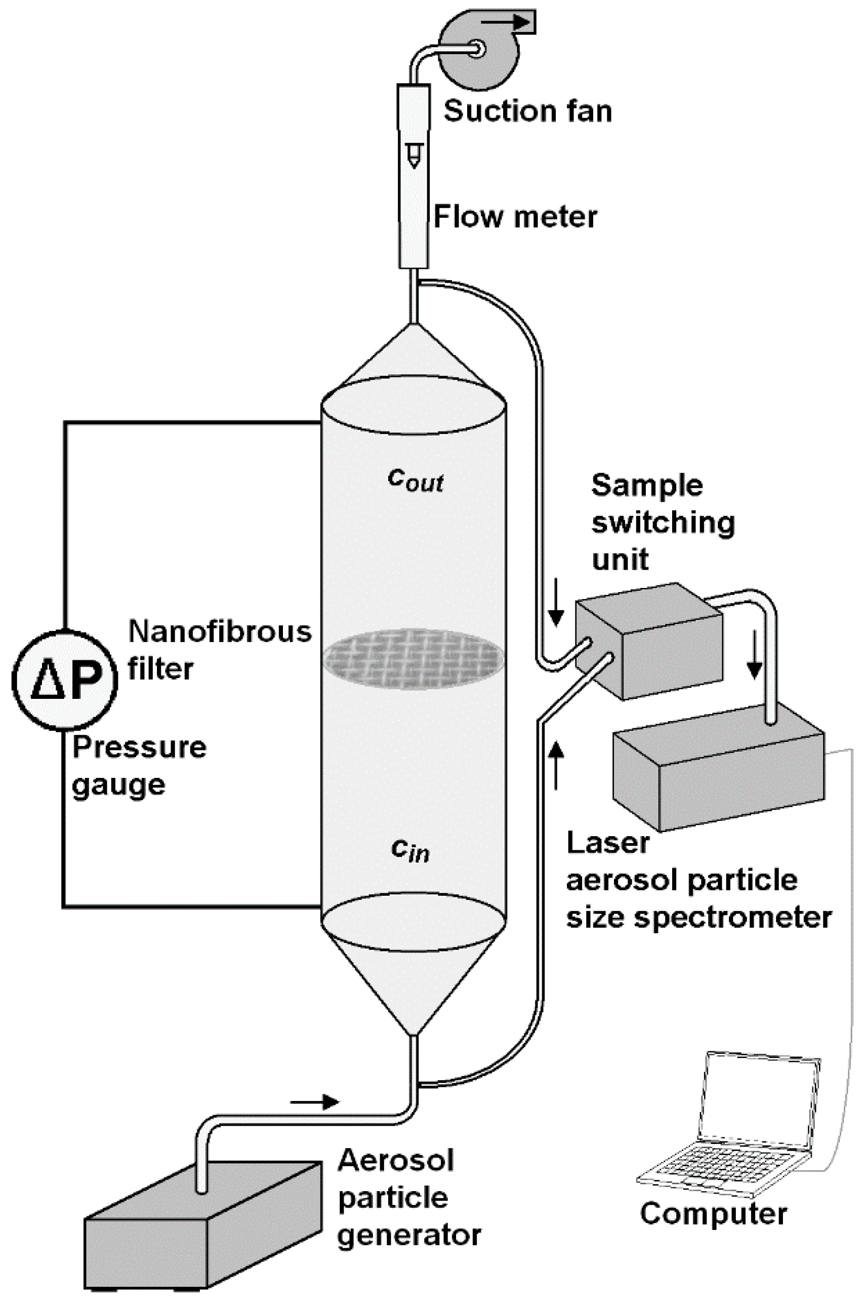 - Recording the particle size distribution at the inlet/outlet by a computer for a 5 min;