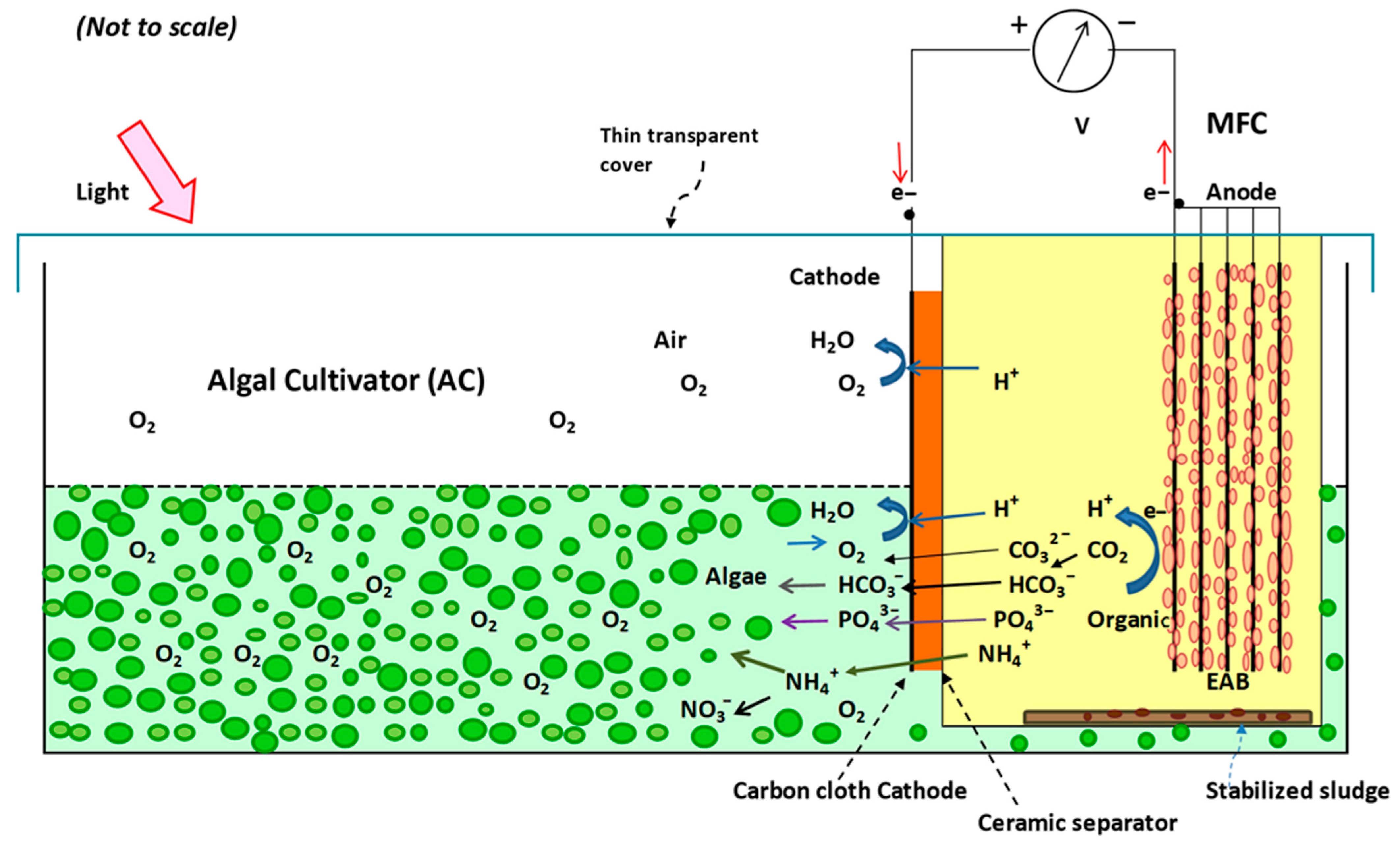 - Kakarla, R.; Min, B. Sustainable electricity generation and ammonium removal by microbial fuel cell with a microalgae assisted cathode at various environmental conditions. Bioresource technology 2019, 284, 161–167. [Google Scholar] [CrossRef]