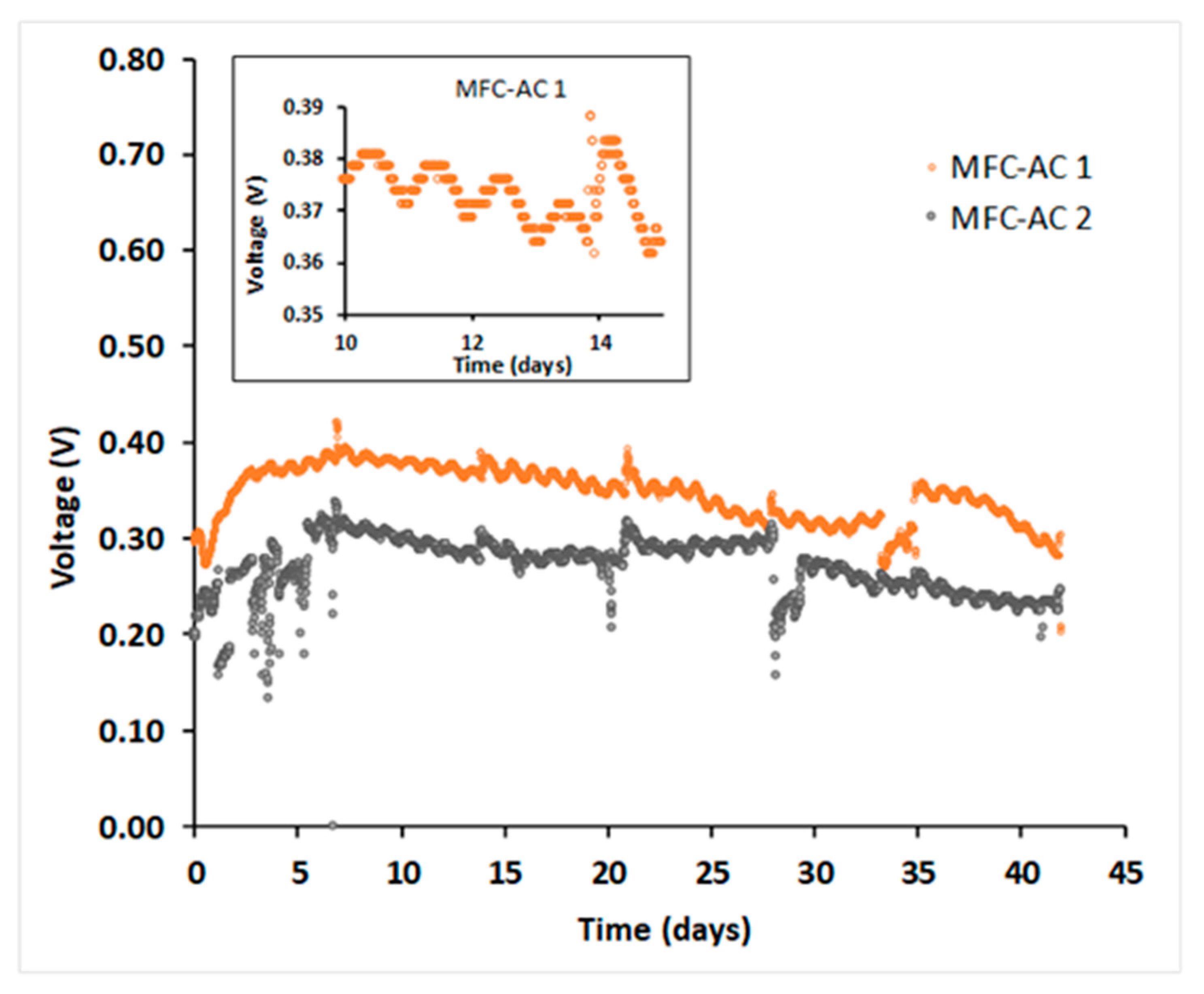 - Huarachi-Olivera, R.; Dueñas-Gonza, A.; Yapo-Pari, U.; Vega, P.; Romero-Ugarte, M.; Tapia, J.; Molina, L.; Lazarte-Rivera, A.; Pacheco-Salazar, D.G.; Esparza, M. Bioelectrogenesis with microbial fuel cells (MFCs) using the microalga Chlorella vulgaris and bacterial communities. Electron. J. Biotechnol. 2018, 31, 34–43. [Google Scholar] [CrossRef]