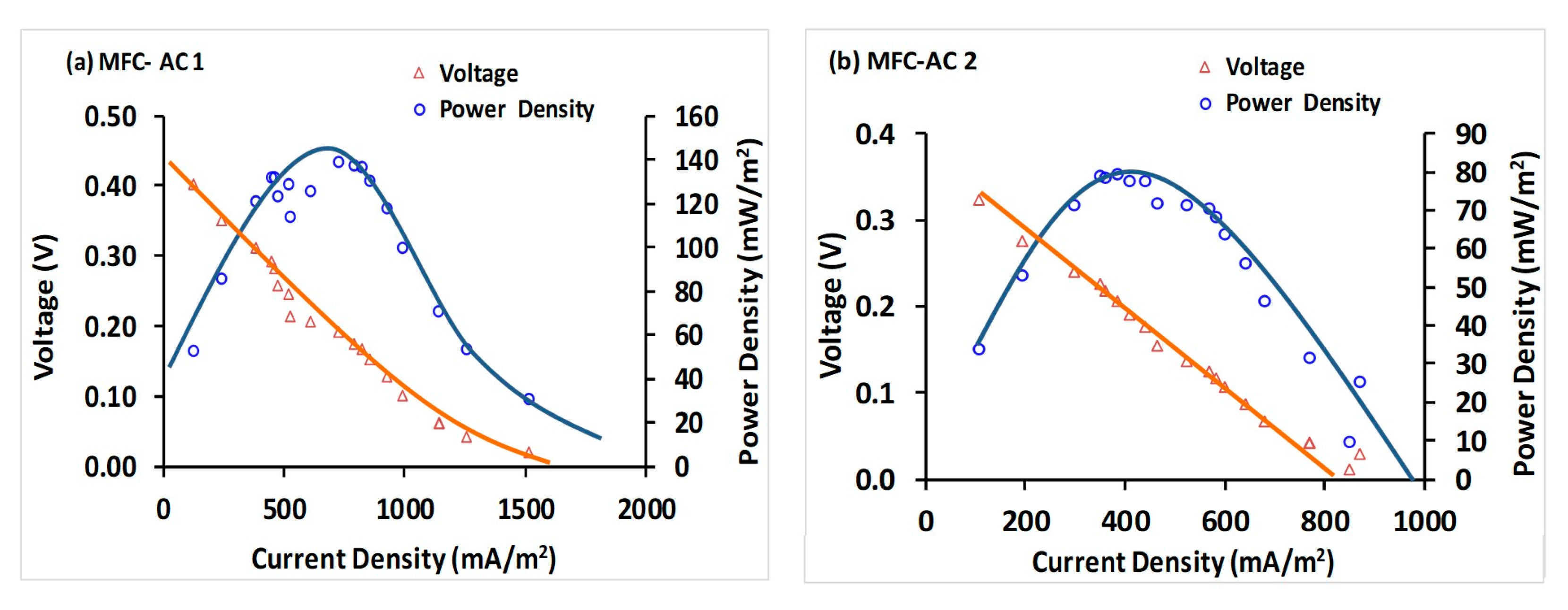 - Maximum power density: 139 ± 0.16 mW m−2 vs. 80 ± 0.01 mW m−2;