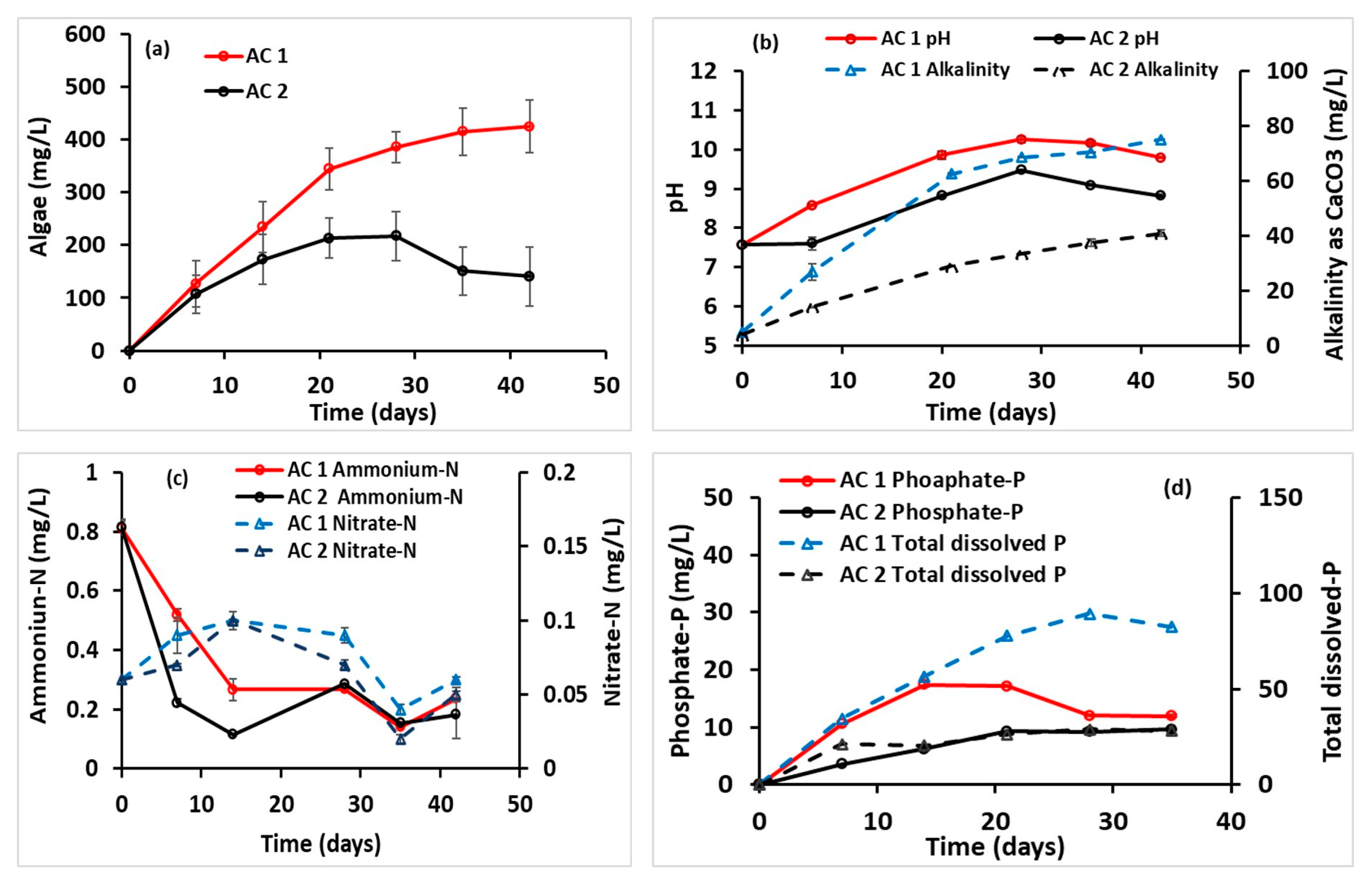 - Algal growth rate: 234 ± 48 mg L−1 d−1 vs. 173 ± 48 mg L−1 d−1;