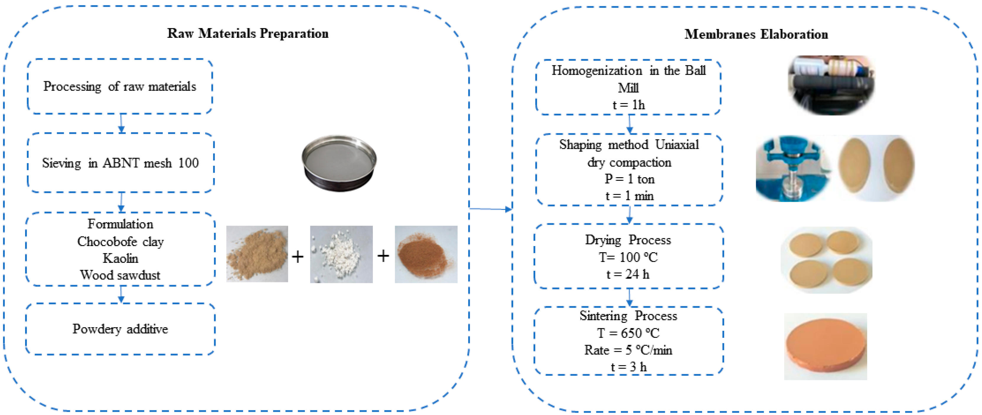 - Silveira, C.; Mulinari, J.; Junior, A.D.N.; Ambrosi, A.; Hotza, D.; Di Luccio, M. Low-cost ceramic membranes prepared from kaolin and quartz via tape casting using different pore formers. Open Ceram. 2025, 22, 100765. [Google Scholar] [CrossRef]