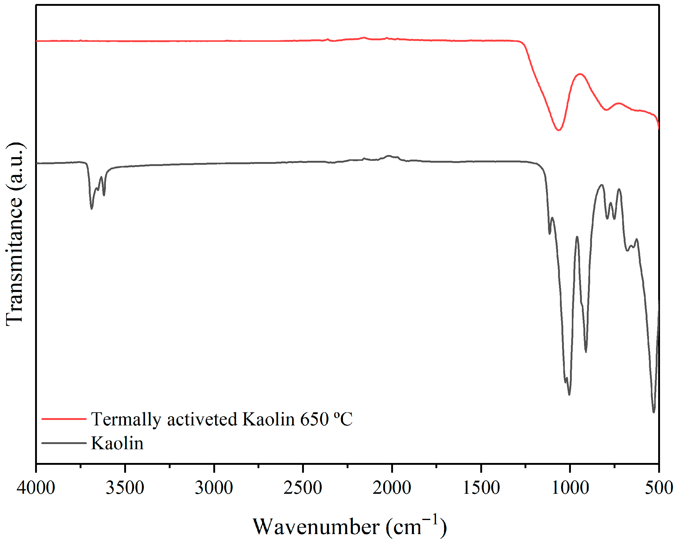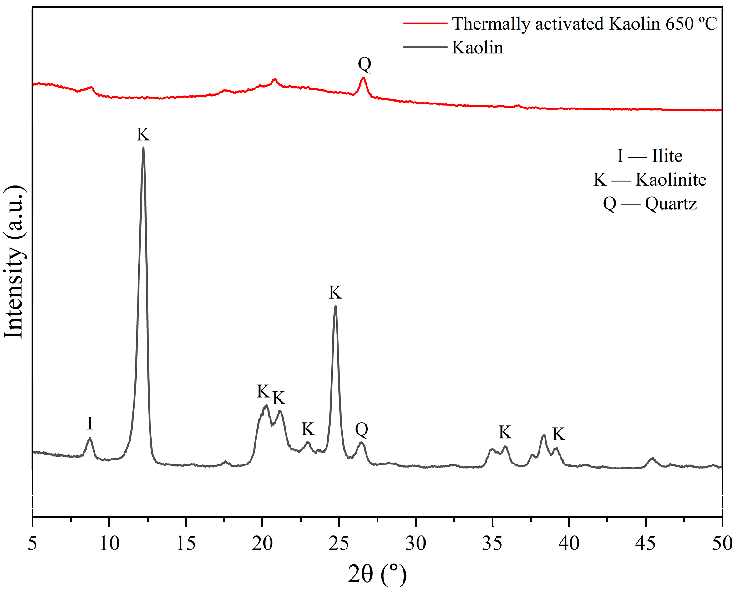 - Maruoka, L.M.A.; Pinheiro, I.F.; Freitas, H.S.; Nobre, F.X.; Scalvi, L.V.A. Effect of thermal annealing on kaolin from the Amazon region, aiming at the production of geopolymer. J. Mater. Res. Technol. 2023, 25, 2471–2485. [Google Scholar] [CrossRef]
