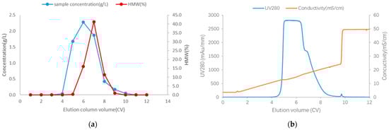 (a) CEX elution profile; (b) CEX UV280 adsorption and conductivity chromatography in the elution phase. Both showed a poor resolution between aggregates and monomers.
